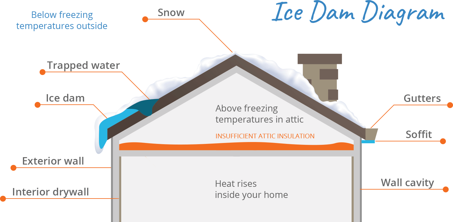 Ice dams are ridges of solid ice that form when melting snow refreezes along the edge of a roof, preventing water from properly flowing off of it. The melting snow and accumulated ice will eventually build-up until it overflows. The accumulated water can then escape into the structure, causing damage to ceilings, walls, insulation or other important equipment that belongs to the interior.